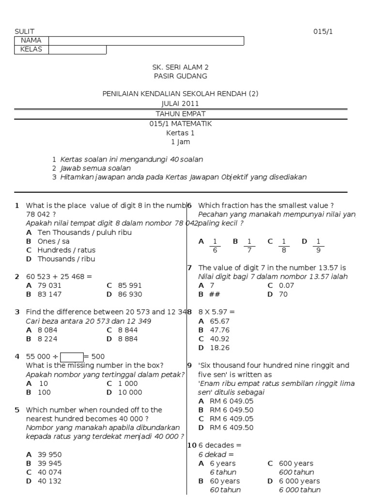 Soalan Matematik Kertas 1 Tahun 4 July Pdf